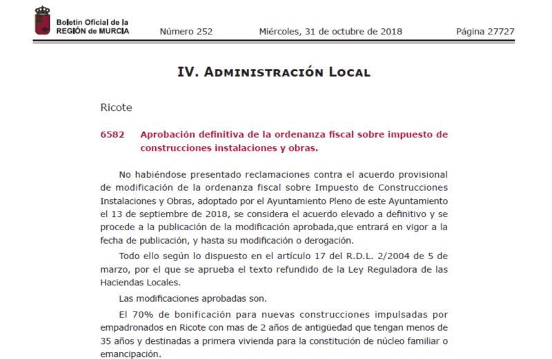 El 70% de bonificación para nuevas construcciones impulsadas por empadronados en Ricote con más de 2 años de antigüedad que tengan menos de 35 años y destinadas a primera vivienda para la constitución de núcleo familiar o emancipación.
