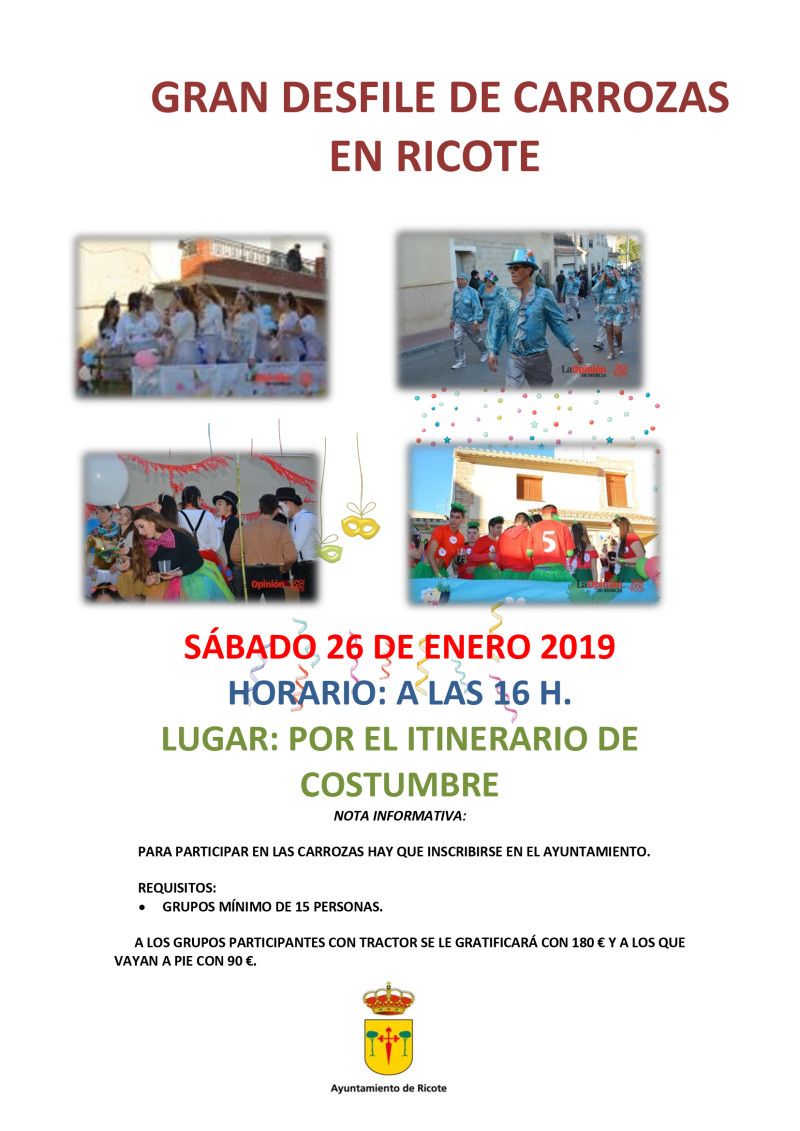 INSCRIPCIÓN EN DESFILE DE CARROZAS EL PRÓXIMO JUEVES 17 DE ENERO A LAS 11 HORAS SE ACABA EL PLAZO DE INSCRIPCIÓN PARA SALIR EN EL DESFILE DE CARROZAS DE RICOTE. AQUELLAS PERSONAS INTERESADAS PUEDEN LLAMAR AL 636652948 (ROSA) Comparte en FacebookTweet