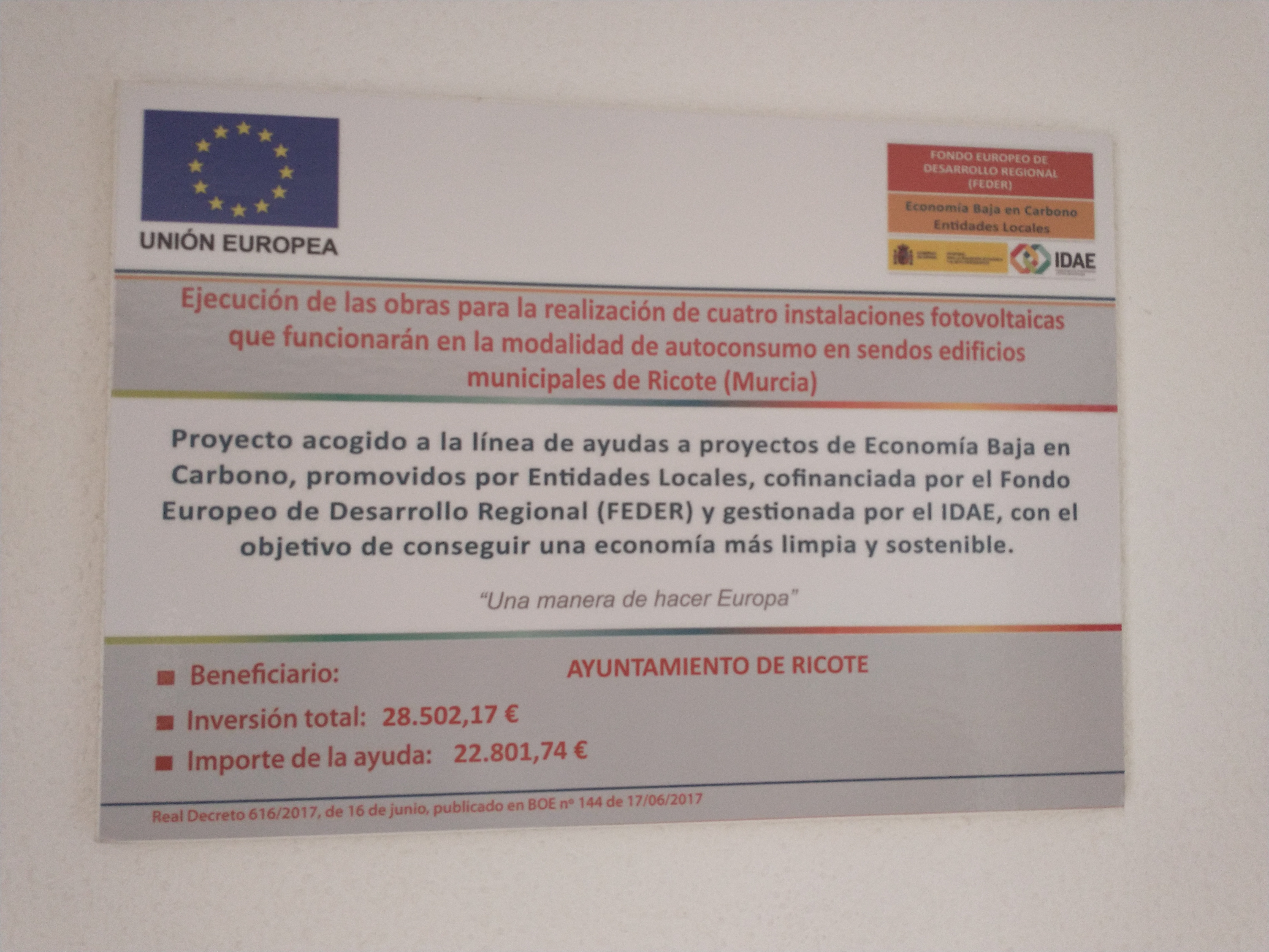 En enero de 2021 se terminaron las obras referentes a las “Ejecución obras para la realización de cuatro instalaciones fotovoltaicas que funcionarán en la modalidad de autoconsumo en sendos edificios municipales de Ricote (Murcia)”, Proyecto acogido a la línea de ayudas a proyectos de Economía Baja en Carbono, promovidos por Entidades Locales, cofinanciadas por el Fondo Europeo de Desarrollo Regional (FEDER) 2014-2020, Medida 15. Instalaciones solares fotovoltaicas destinadas a generación eléctrica para autoconsumo (conectadas a red y aisladas) y gestionada por el IDAE.
