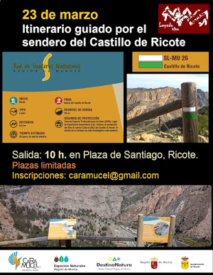 Itinerario guiado a través del SL-MU 26 Castillo de Ricote, durante el cual se realizarán algunas paradas interpretativas en los puntos de mayor interés. Este itinerario forma parte de las actividades de rehabilitación de este sendero, que recientemente ha sido integrado en la Red de Senderos Naturales de la Región de Murcia y homologado por la Federación de Montañismo de la Región de Murcia. Las actuaciones de puesta al día de la señalización, contenidos de los carteles interpretativos y labores de mejora de la senda, han sido realizadas por la asociación CARAMUCEL, junto a la Dirección General del Medio Natural de la Comunidad Autónoma de la Región de Murcia, dentro del espacio Red Natura 2000 de la ZEPA y LIC de Sierra de Ricote y Navela, contando con la colaboración del Ayuntamiento de Ricote, así como de la asociación Cultural La Carrahila dentro del proyecto Legado Vivo.