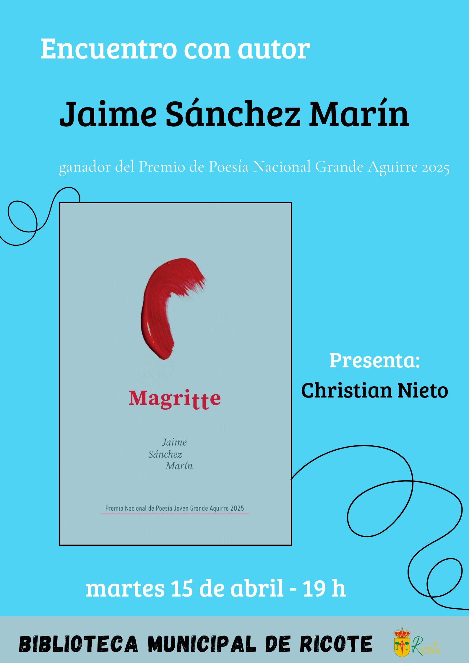 El Centro Cultural de Ricote ha organizado un encuentro con Jaime Sánchez Marín, ganador del Premio Nacional “Grande Aguirre”. Nos visitará esta tarde a las 19 h, y le acompañará nuestro vecino Christian Nieto Tavira.