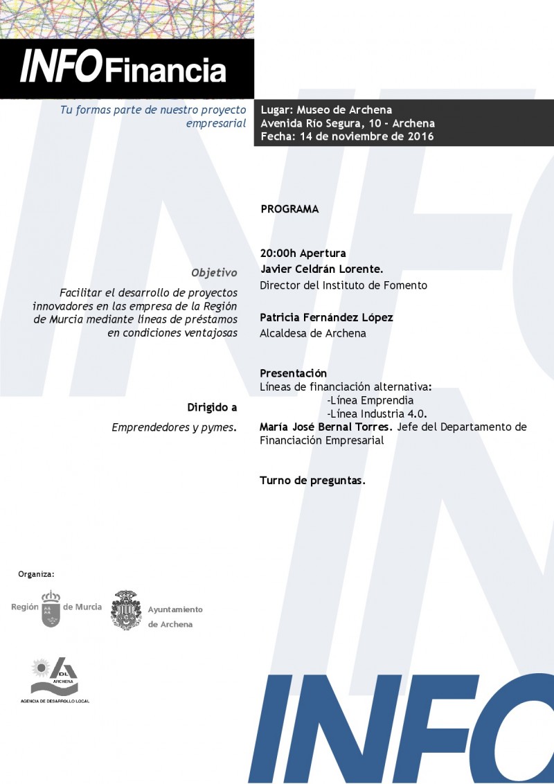 El Instituto de Fomento de la Región de Murcia le invita a la presentación de las dos nuevas líneas de financiación en condiciones preferentes que, por importe global de 34 millones de euros provenientes del Banco Europeo de Inversiones y del Instituto de Crédito y Finanzas de la Región de Murcia, pone a disposición de las empresas y emprendedores de la Región de Murcia.