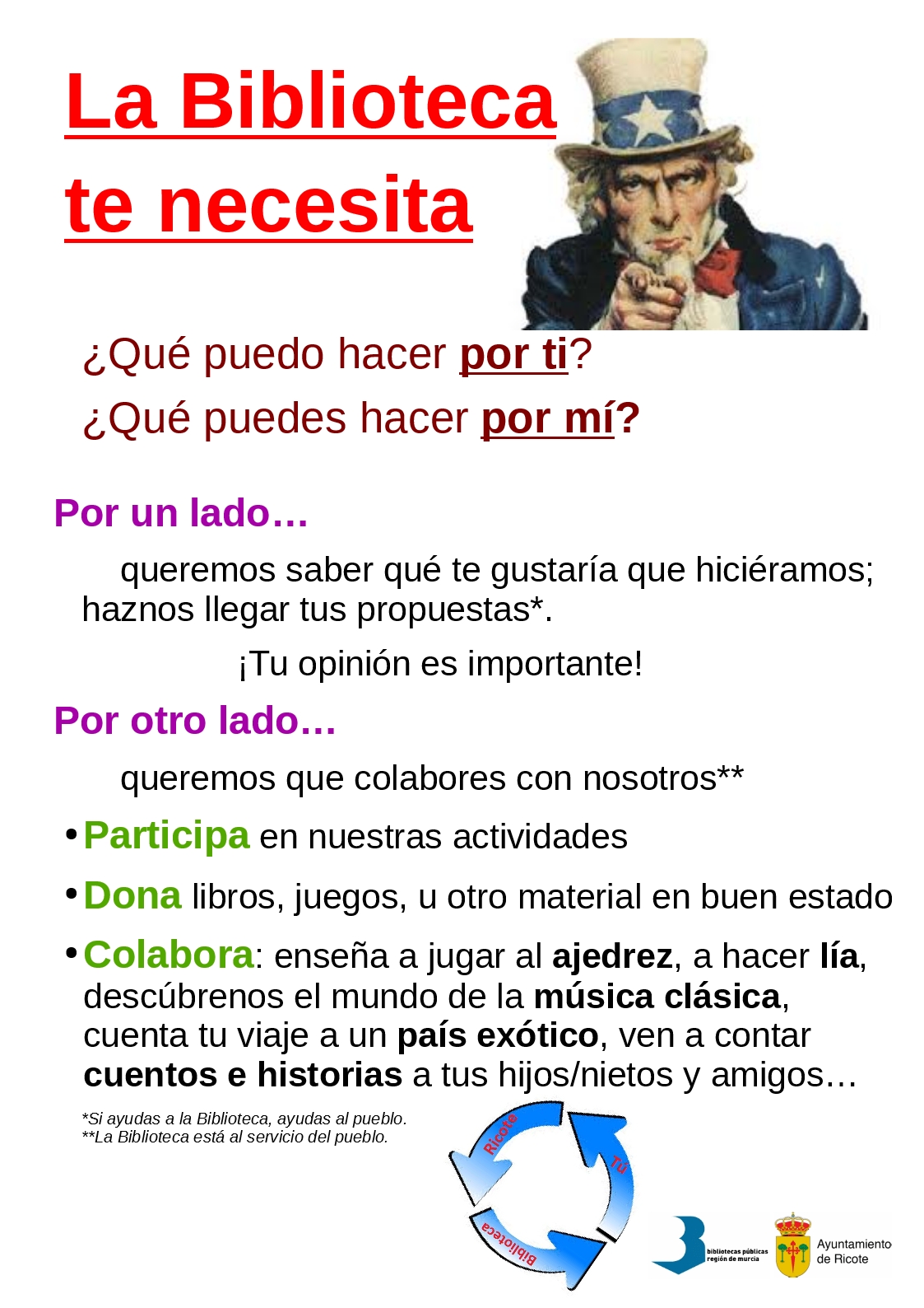 La Biblioteca te necesita La Biblioteca quiere saber qué puede hacer por ti. Haznos llegar tus sugerencias y comentarios. Además, te pide que participes con el Centro Cultural-Biblioteca: colaborar con nosotros es colaborar con tu pueblo. ¡Contamos contigo! Comparte en FacebookTweet