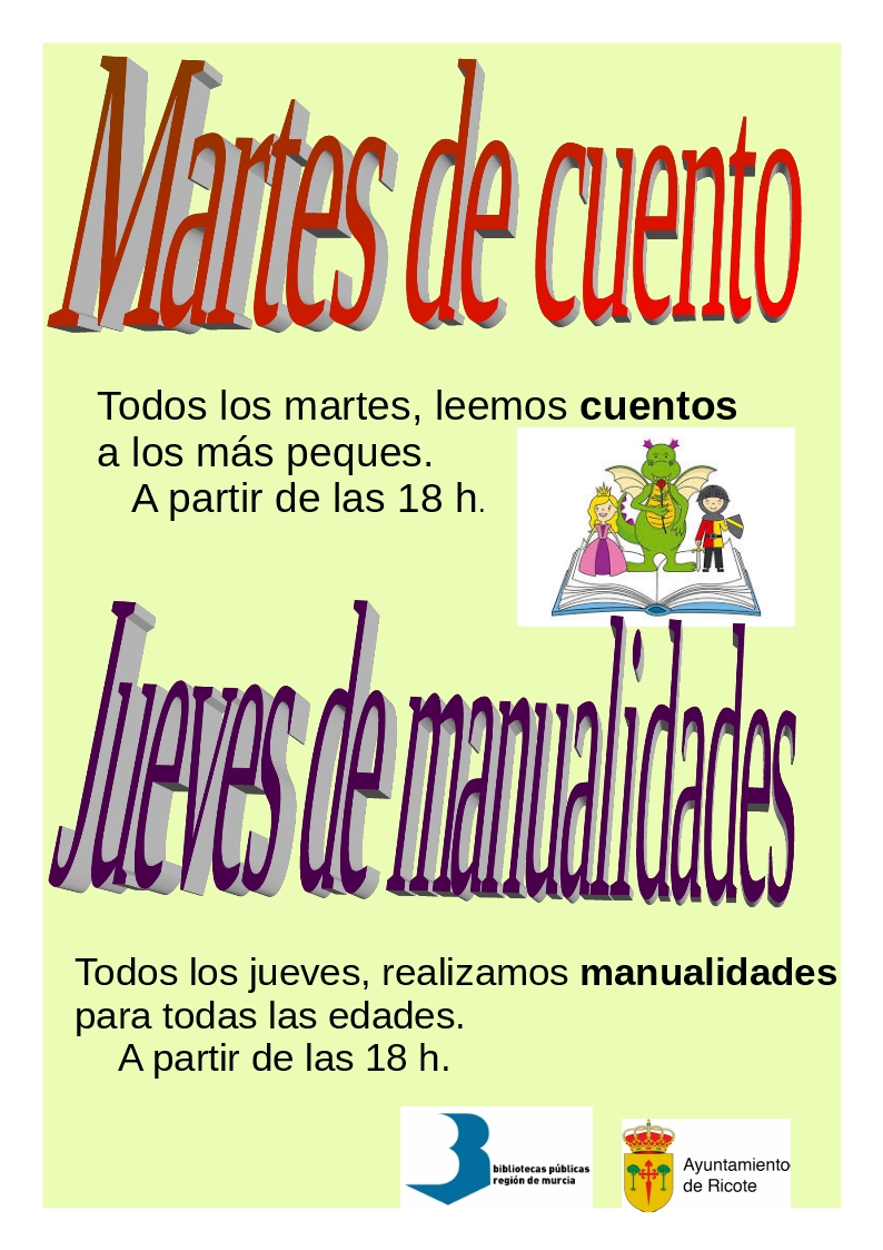¡Martes de cuento…y jueves de manualidades! Todos los martes contamos cuentos, a las 18 h. Y los jueves hacemos manualidades, a las 18 h. Este es tu Centro Cultural: ¡disfrútalo! Comparte en FacebookTweet