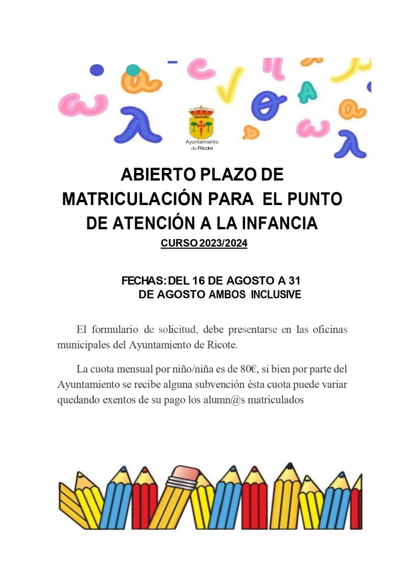 SE ABRE EL PLAZO DE MATRICULACIÓN PARA EL PUNTO DE ATENCIÓN A LA INFANCIA(PAI) PARA EL CURSO 2023/2024 DESDE EL 16 DE AGOSTO A 31 DE AGOSTO AMBOS INCLUSIVE.