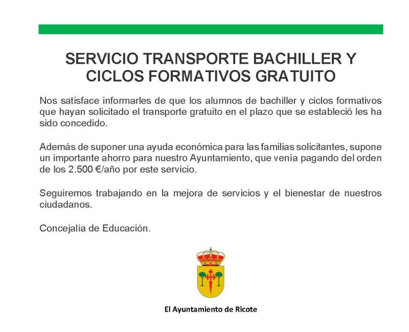 Nos satisface informarles de que los alumnos de bachiller y ciclos formativos que hayan solicitado el transporte gratuito en el plazo que se estableció les ha sido concedido.