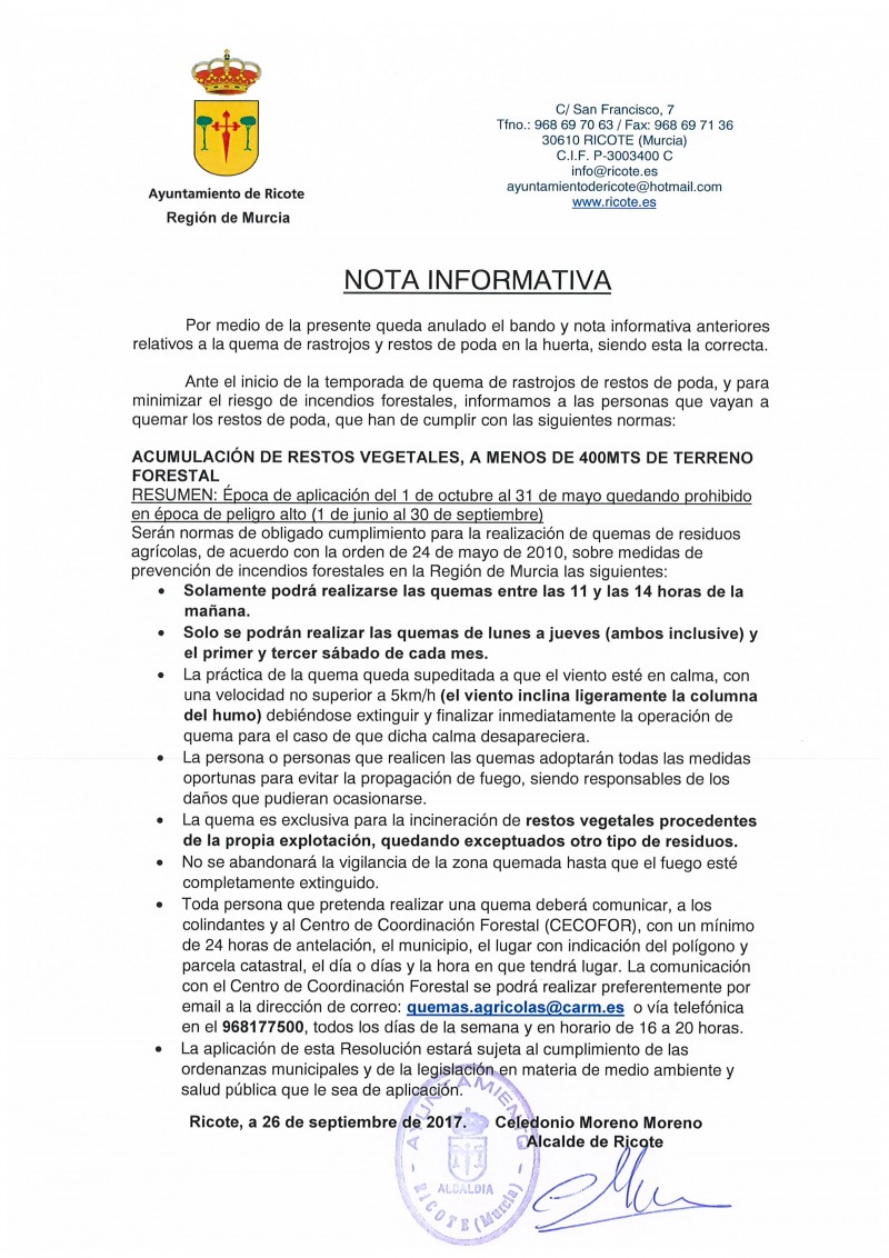 NOTA INFORMATIVA QUEMA DE RASTROJOS DE RESTOS DE PODA