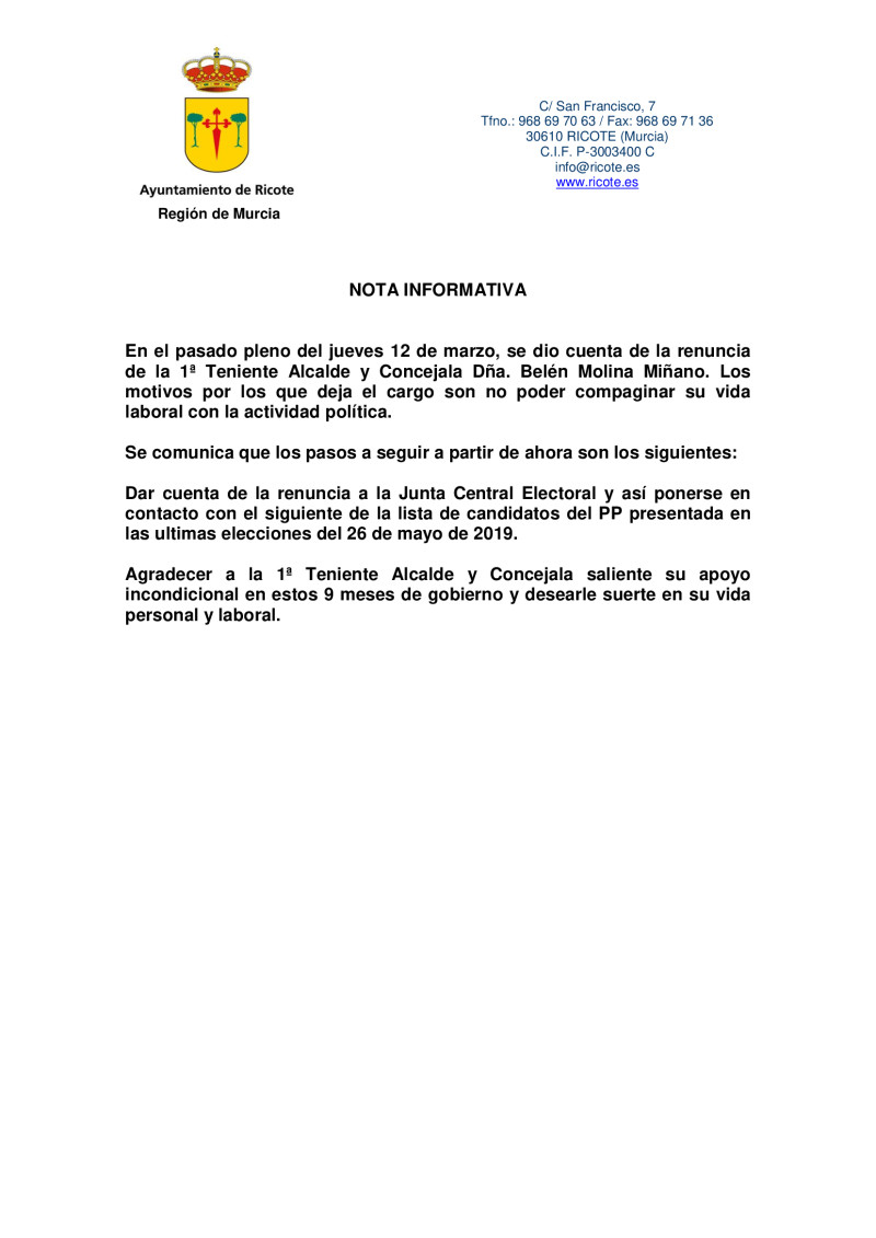 Nota informativa renuncia 1ª Teniente Alcalde-Concejala