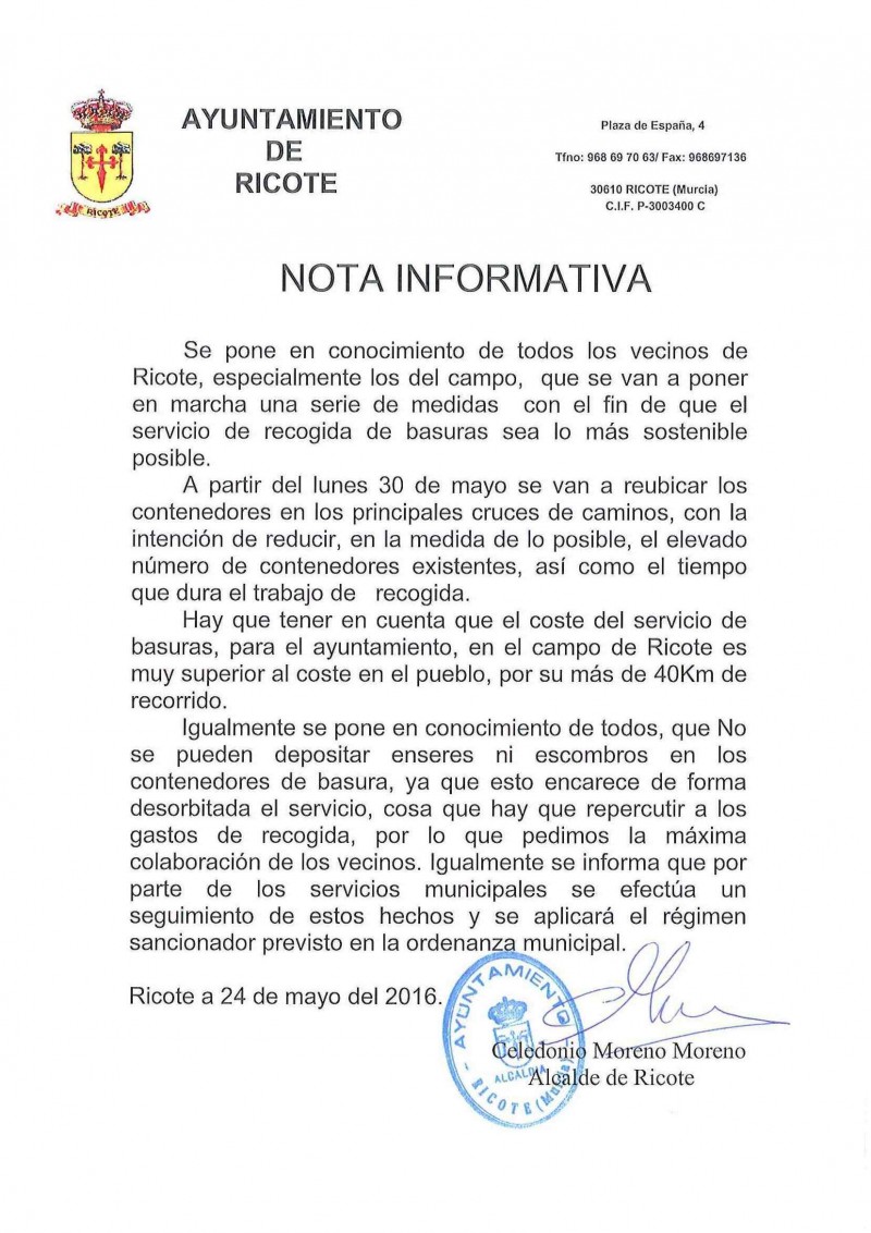 NOTA INFORMATIVA SERVICIO RECOGIDA BASURAS