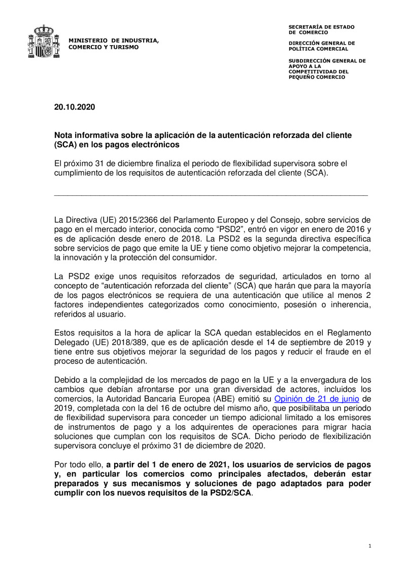 Nota informativa sobre la aplicación de la autenticación reforzada del cliente (SCA) en los pagos electrónicos Comparte en FacebookTweet