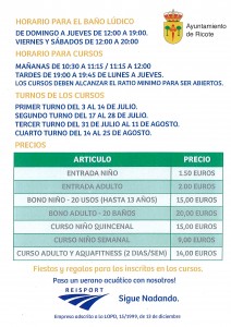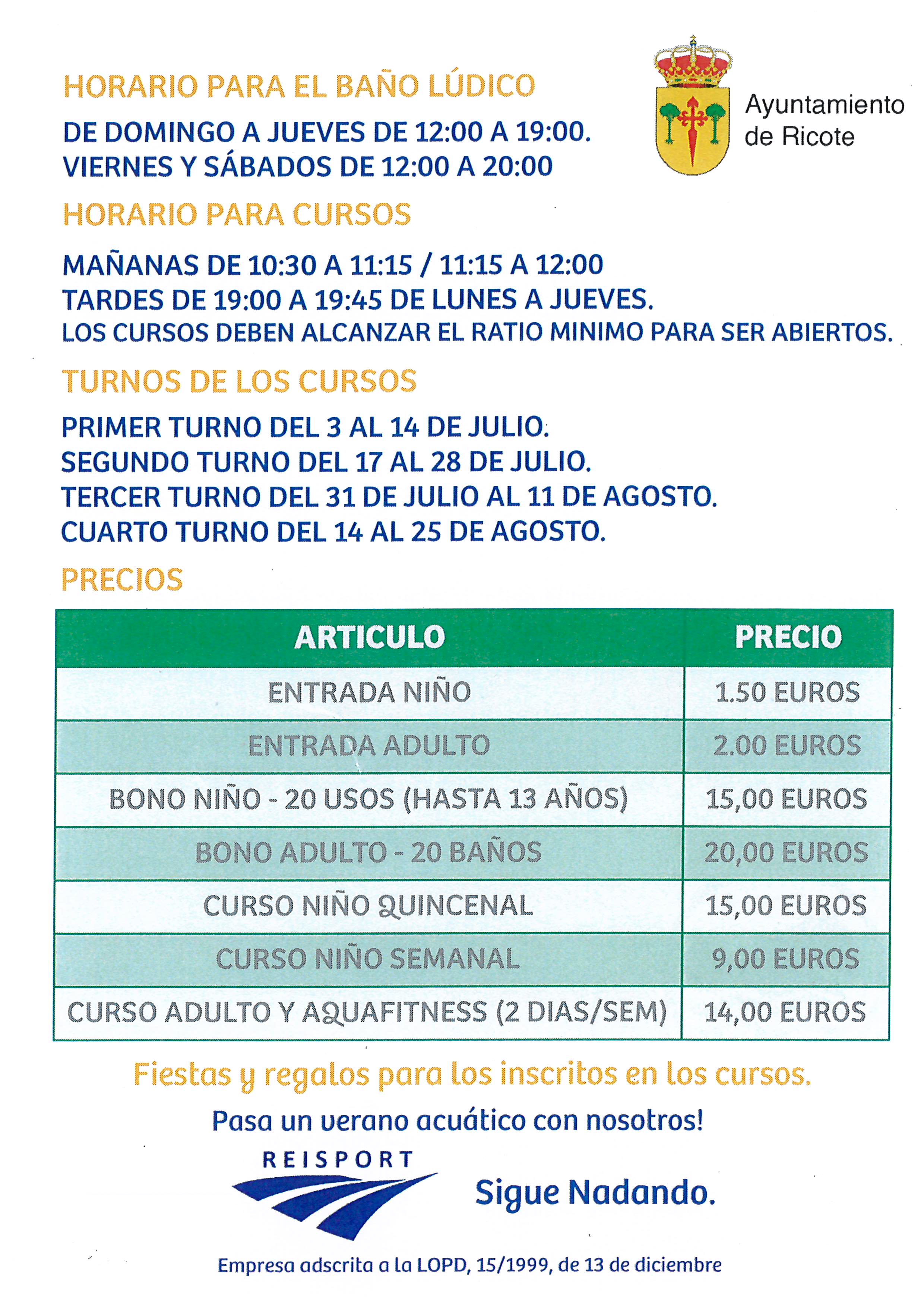 PISCINA MUNICIPAL DE RICOTE El día 23 de junio a las 13:00, abrimos la piscina de verano!! Apúntate en la instalación a nuestros cursos de niños, adultos, aquafitnes, etc. Comparte en FacebookTweet