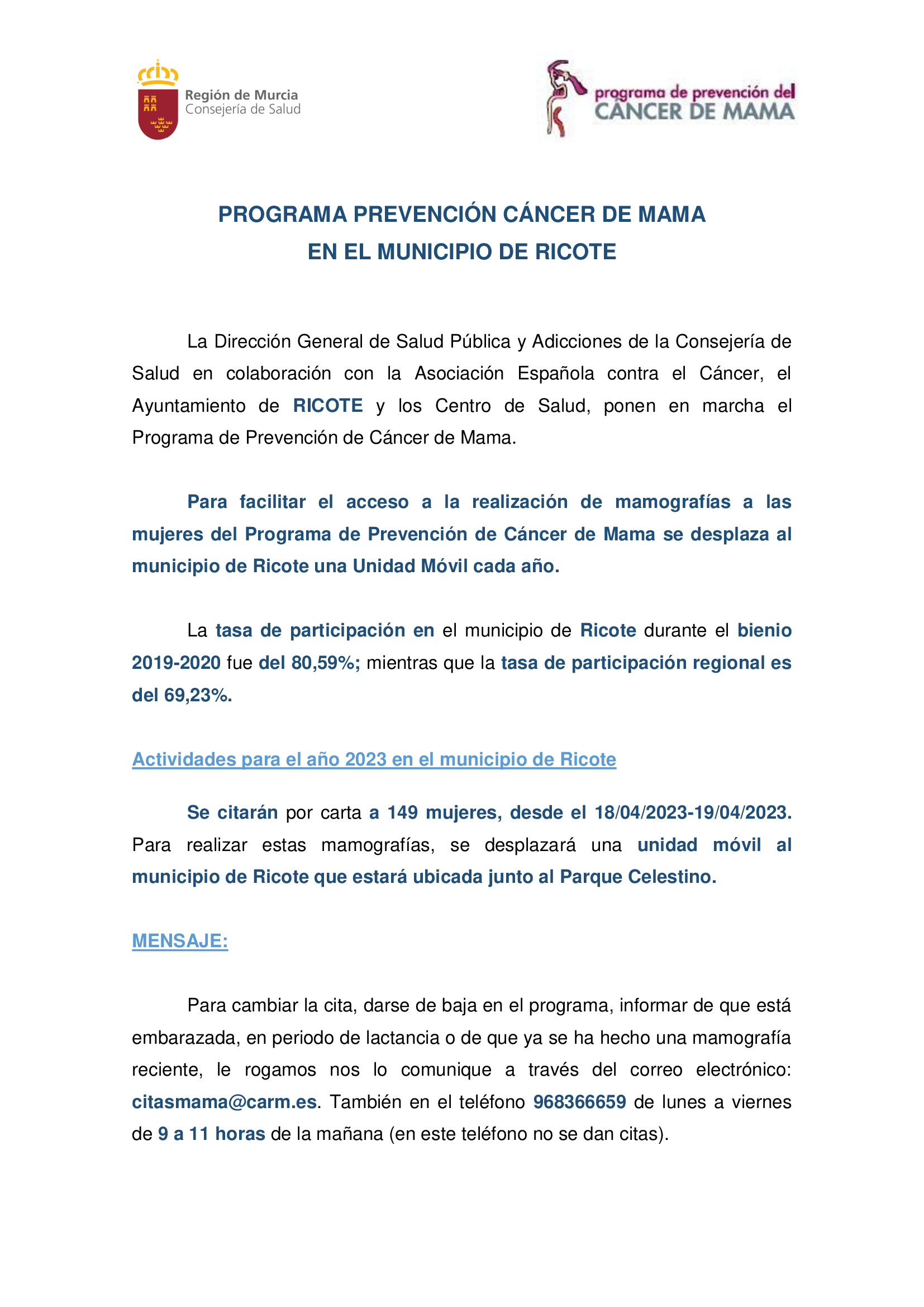 Se citarán por carta a 149 mujeres, desde el 18/04/2023-19/04/2023. Para realizar estas mamografías, se desplazará una unidad móvil al municipio de Ricote que estará ubicada junto al Parque Celestino.