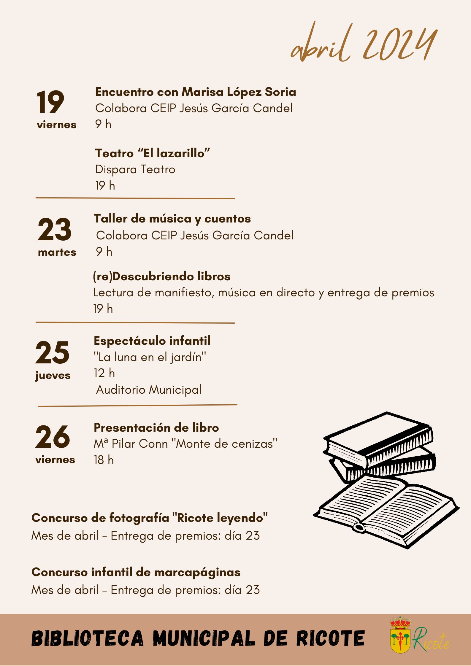 Con motivo del Día Internacional del Libro, 23 de abril, se ha preparado una programación para este mes para todos los públicos, que incluye exposiciones, cuentacuentos, juegos, concursos, música y teatro.