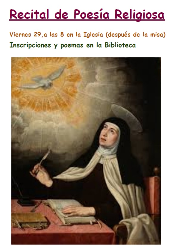 -también el viernes 29, tendremos un Recital de Poesía Religiosa, a las 8, después de misa en la Iglesia. Si quieres leer, en la Biblioteca te apuntamos y te facilitamos poemas.