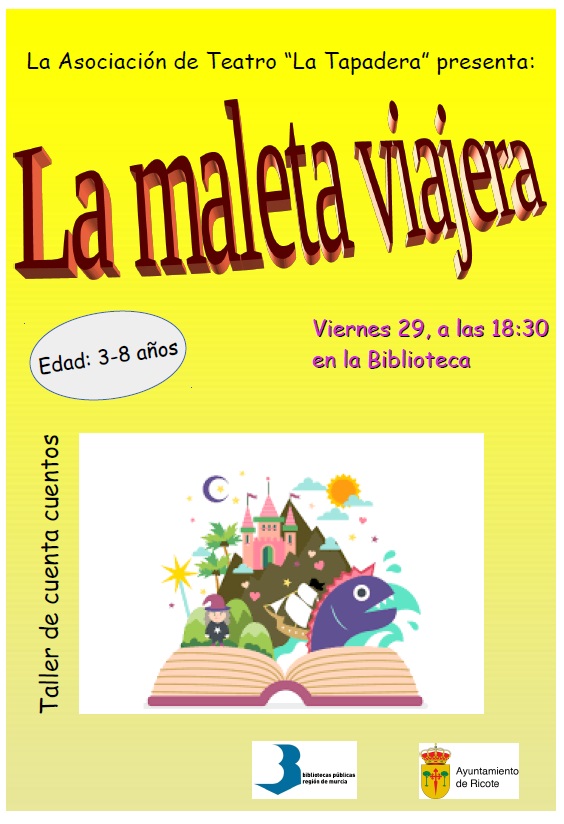 -el viernes 29, la Asociación de Teatro “La Tapadera” nos trae La Maleta Viajera, actividad para niños de 3 a 8 años. A las 18:30 h. en la Biblioteca.