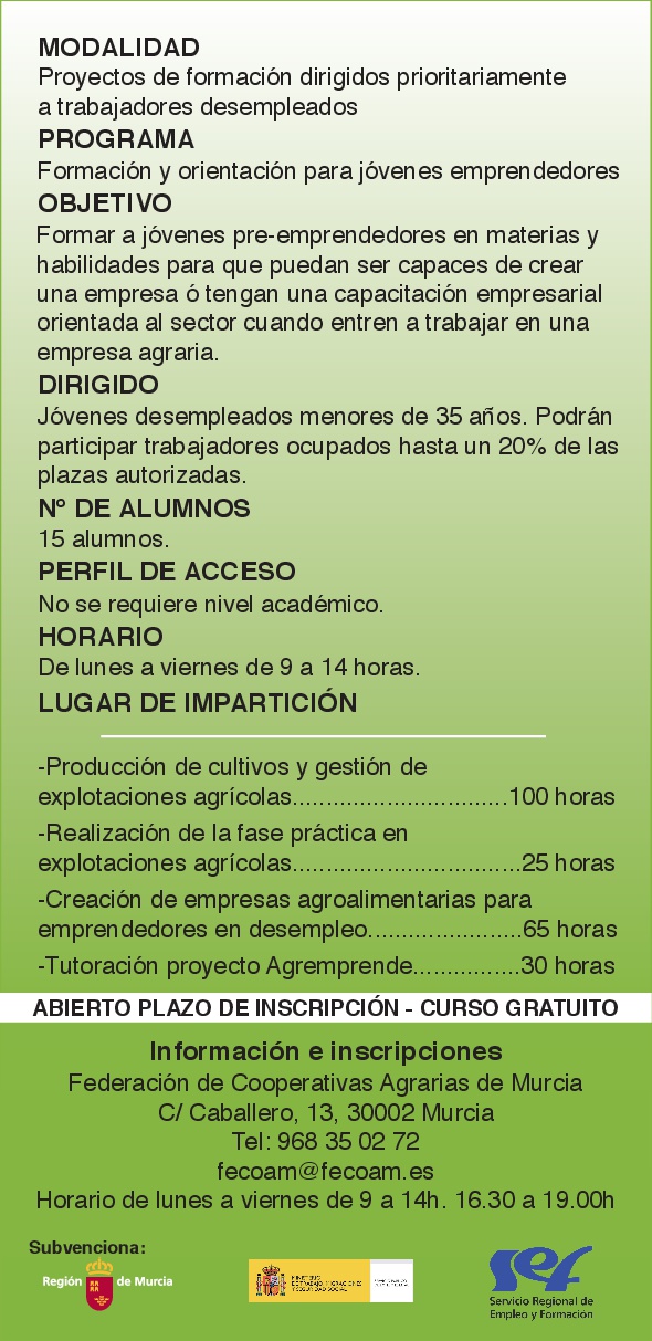 El proyecto, que se desarrollará en diferentes municipios de la Región de Murcia, estará coordinado por FECOAM, los Servicios de Orientación del SEF y el Instituto de Fomento de la Región de Murcia, y está destinado a desempleados menores de 35 años con interés en la creación de nuevas empresas y a futuros agricultores de explotaciones agrarias, e integra las siguientes actuaciones:
