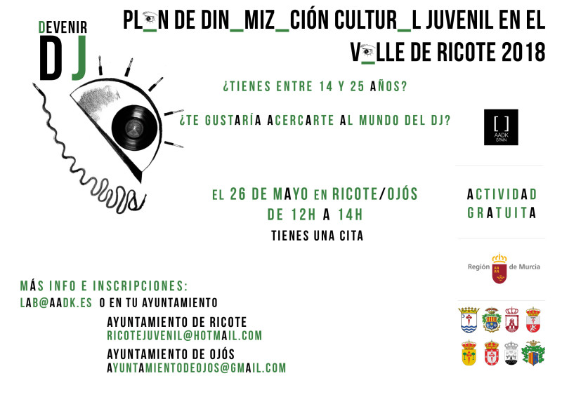 TALLER DE DJ EL PRÓXIMO SÁBADO 26 DE MAYO DE 12 A 14 HORAS EN EL CENTRO JUVENIL DE RICOTE, REALIZAREMOS UN DIVERTIDO TALLER PARA QUE LOS/AS JÓVENES QUE QUIERAN INICIARSE EN EL MUNDO DEL DJ PUEDAN HACERLO GRATUITAMENTE. INSCRIPCIONES EN AYUNTAMIENTO DE RICOTE Comparte en FacebookTweet