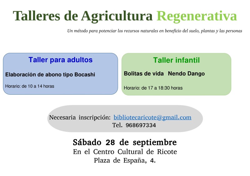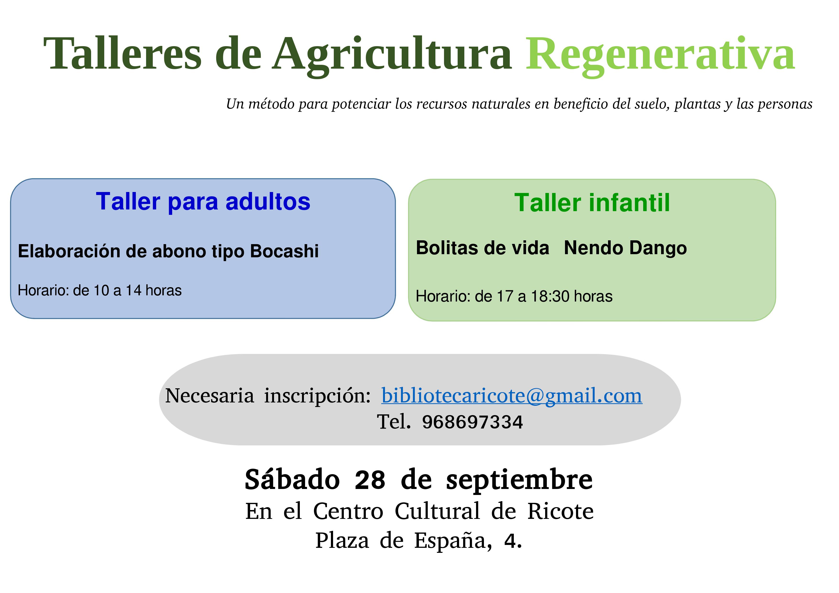 El sábado 28 de septiembre, en el Centro Cultural de Ricote, se realizará un taller para adultos enfocado a elaborar abono tipo Bocashi. Se trata de un técnica que nutre el cultivo, mejora las condiciones físicas y químicas, previene enfermedades del suelo e integra nutrientes para el desarrollo de los cultivos.
