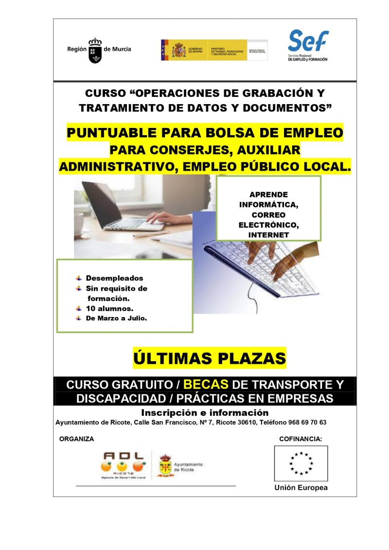 ÚLTIMAS PLAZAS CURSO “OPERACIONES DE GRABACIÓN Y TRATAMIENTO DE DATOS Y DOCUMENTOS” Comparte en FacebookTweet
